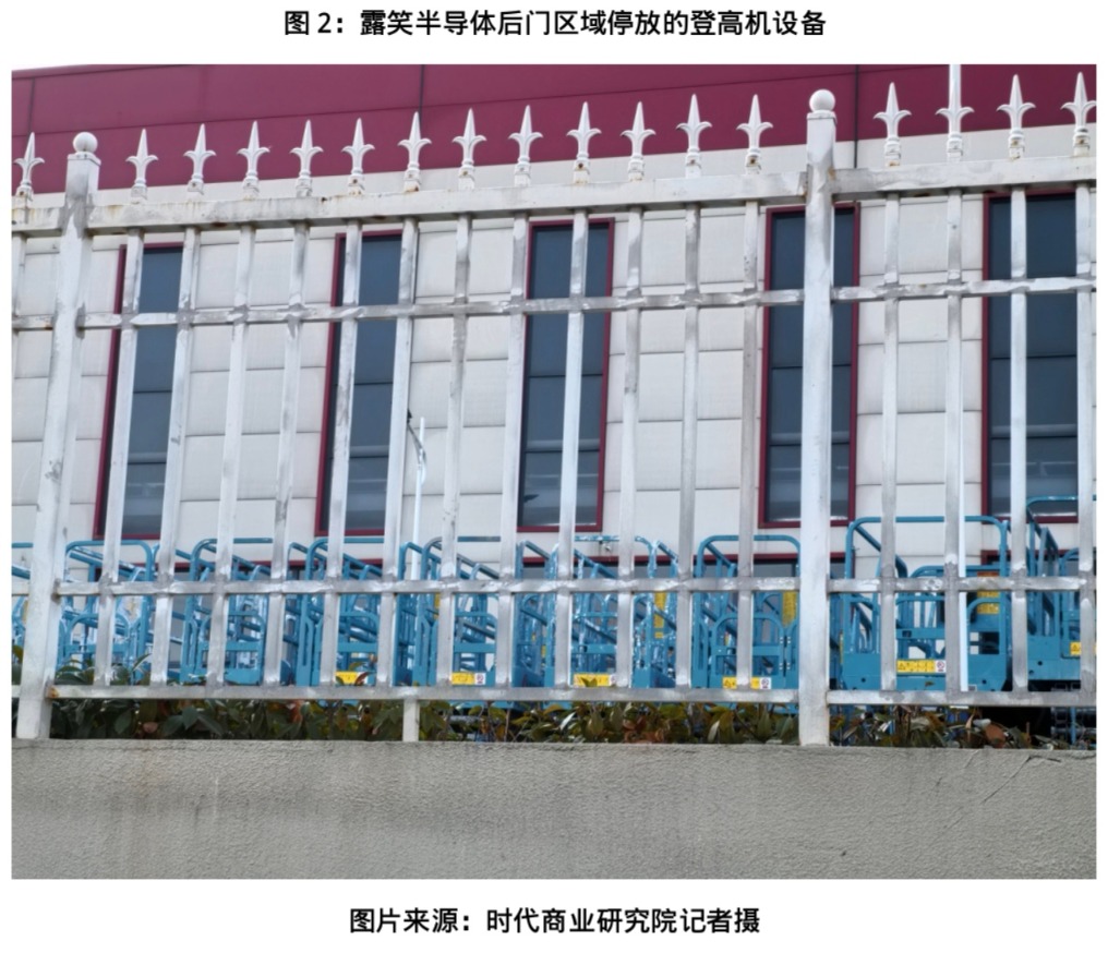 值得一提的是,露笑半导体后门紧邻的地块是另一家企业在建的双凤路加油加气充电合建站项目,机器轰鸣,建筑工人忙得热火朝天。记者在合建站工地外面走访时,建筑工人张磊(化名)向记者透露了诸多令人意外的细节。“我们跟它(露笑半导体)没接触,这(后)门口很少有车,一个星期顶多有一辆车进出。”他抬手指着露笑半导体后门的区域告诉记者,这厂区内空地堆放着不少工程设备,“里面放着好多曲臂车、登高车,看着就不是他们自用的,估计都是人家用来出租的”。记者循着他指的方向抬头望去,透过后门旁边墙上的栅栏向内窥探,果然发现一整排登高机整齐停放着,机身并非崭新模样,表面附着着明显的白灰斑点,是长期使用后留下的痕迹。