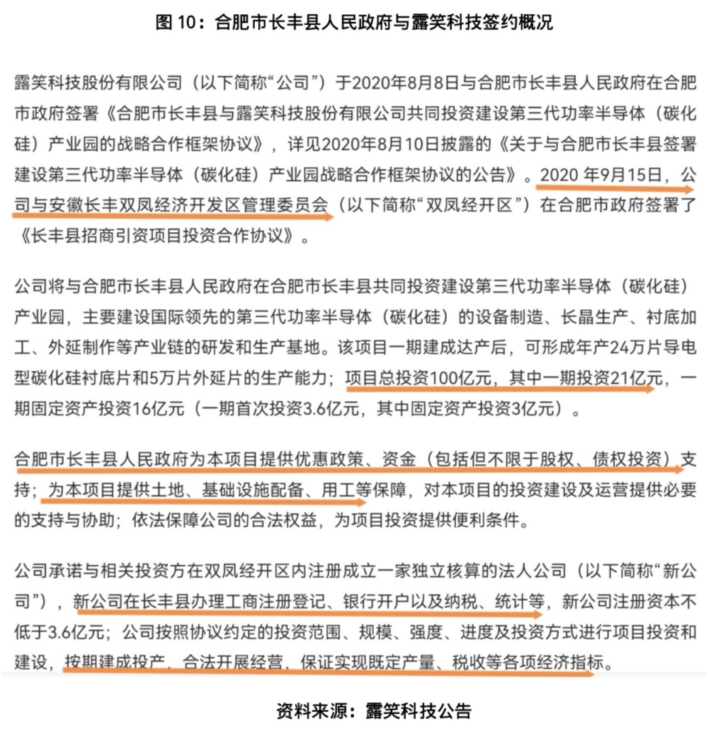 回溯露笑科技的碳化硅布局,起点充满想象空间。2020年起,国内第三代半导体产业迎来政策密集扶持的“黄金窗口期”,从“新型基础设施建设三年行动计划”到地方半导体产业专项补贴,政策红利持续释放。就在这一年,以漆包线业务为核心的露笑科技突然跨界,与合肥市长丰县人民政府签约共建第三代功率半导体(碳化硅)产业园,项目投资额高达100亿元。